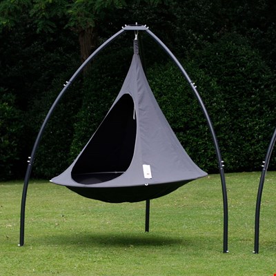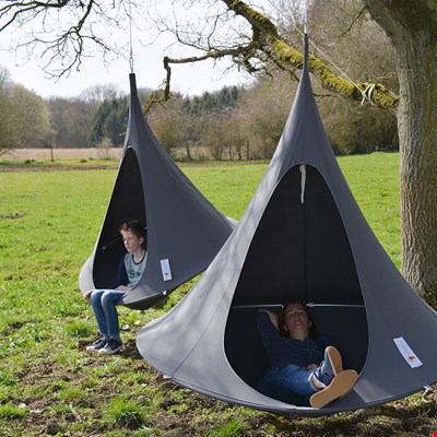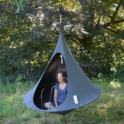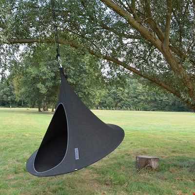 Create your very own piece of paradise with the Double Hanging Cacoon in Anthracite Grey: a luxury hammock style chair for hanging indoors or outdoors and an eye catching piece of garden seating, created by Cacoon. Top grade fabrics developed for the marine and camping industries are used to make Cacoons, a blend of cotton and polyester keeps the canvas soft to touch and its durable, mold, water and UV resistant outer is protected from all the elements will throw at it. It includes a strong rust proof aluminium ring that forms and retains the base shape when being sat in and the Cacoons are tested in just about every environment you can think of, so you know it's strong. Should you wish to take it down, the Cacoon folds down to a manageable size (25 x 80 cm for the double) to help you transport it anywhere you like; holidays, camping, back gardens or in a classroom, bedroom, snug or den - the Cacoon is the ultimate in relaxation whether outdoors or in, for kids and adults alike. This Cacoon is also available in a single - great for you and only you!