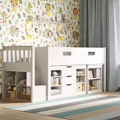 This stylish and super practical Charlie Mid Sleeper Kids Bed from Flair Furnishings is a brilliant space saving option for your little nipper's bedroom. Not only does this fabulous piece of furniture offer you a fun and sturdy kids bed, but it has the added bonus of housing oodles of storage in every nook and cranny. Space for teddies, dolls, board games, books, clothing, collections of fossils, cress growing egg shell heads...there is room for all sorts! Leaving the rest of the floor space free for playtime! And with a pull out desk, perfect for doing homework or creating a Picasso masterpiece, what more could you ask for?!
