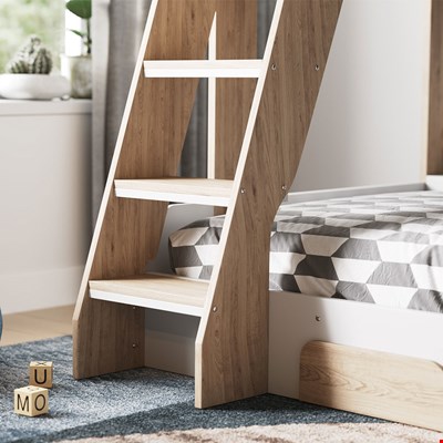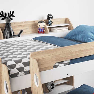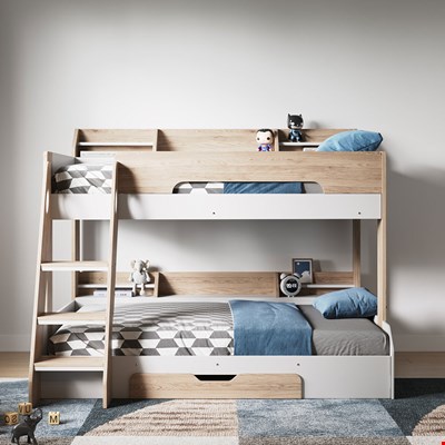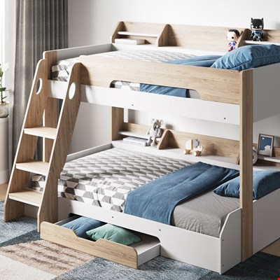 This fabulous Flick Triple Bunk Bed in Oak and White is a new release from Flair Furnishings and we think it is simply divine! This multi-purpose unique sleeping station can either be used in a child's bedroom as a double bed for an older child or teen, and a bunk up top for a younger sibling. Or, ditch conventional sleeping arrangements and create a scrumptious family bedroom with mum & dad snuggled up below with little nipper up above! A great idea for disturbed kiddies and unsettled sleepers who need the reassurance of someone close by. Alternatively, for the larger family, pop all three kids in the same room! We can't guarantee there'll be much sleeping happening but imagine the bonding midnight feasts! Whichever way you you use the Flick Triple Bunk Bed, we assure you happy kids!