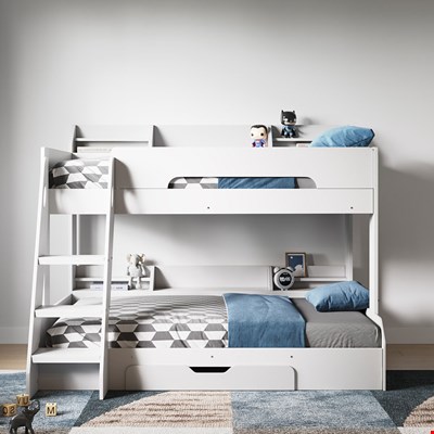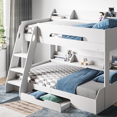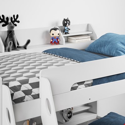 This fabulous Flick Triple Bunk Bed in White is a new release from Flair Furnishings and we think it is simply divine! This multi-purpose unique sleeping station can either be used in a child's bedroom as a double bed for an older child or teen, and a bunk up top for a younger sibling. Or, ditch conventional sleeping arrangements and create a scrumptious family bedroom with mum & dad snuggled up below with little nipper up above! A great idea for unsettled sleepers who need the reassurance of someone close by. Alternatively you can use this multi functional bunk bed in a guest room, so when you have visitors they will have a cool place to sleep - beware though you may end up with them staying for longer than anticipated!