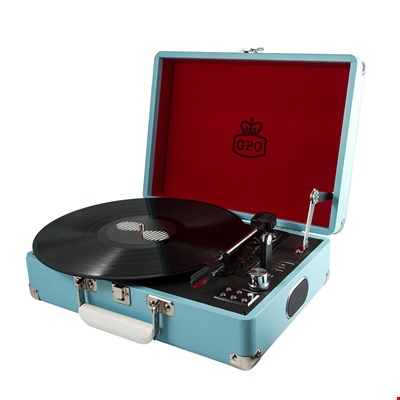 Our Vinyl Revival Retro Record Player! The showstopping GPO Attaché Retro Record Player in French blue suitcase design has built in speakers and it's vintage carry case makes it easy to listen to your favourite vinyl wherever you are. Made of wood and bound in leatherette this briefcase styled record player features 2 built-in 1.5W stereo speakers so you can tune in without needing a speaker system. Alternatively, you can connect the Attache to additional speakers via RCA audio output. You can record all your old vinyl on to the USB stick (included). This vintage LP turntable plays vinyls at three different speeds 33, 45 and 78rpm and makes a perfect retro music gift for her or him.