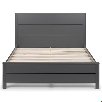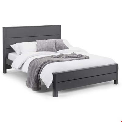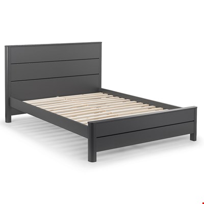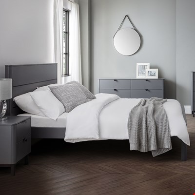 Add the finishing touch to your bedroom with the Chloe bed from Julian Bowen. Finished with a beautiful storm grey lacquer, this piece will add a modern edge to your room. It's rounded corners add a touch of softness, while the recessed lines in the headboard make a great design feature. Available in both double or kingsize there will be a bed to suit any size of room. Complete the look by adding the matching pieces from the Chloe range to create a calming sleep haven.