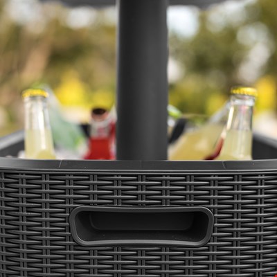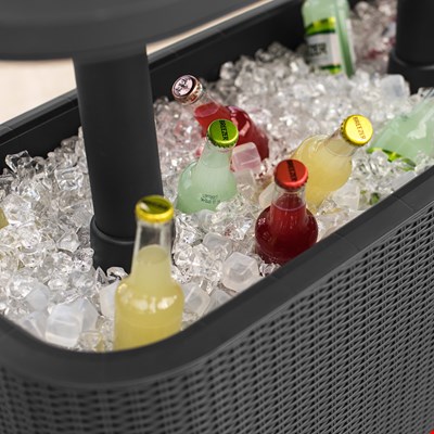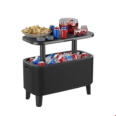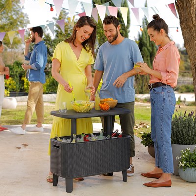 Get the party started with the Bevy Bar from Keter! With a double wall cooler, you'll have no shortage of perfectly chilled beverages ready to pass around at the next BBQ or family get together! With space for 65 bottles or 130 cans, no one will be going thirsty and what's even better is the top is perfect for housing all those chips, dips and tasty snacks...what more could you want from a table?! Did we mention it's water-resistant too, so even if the British weather decides to give you a shower this hardy piece of kit will survive all weathers!