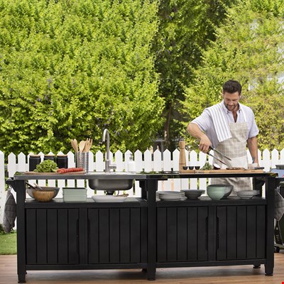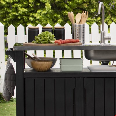 Become the ultimate BBQ Champ with the Unity Chef Kitchen from Keter. With a large prep station, sink and 470L of storage, you'll have those burgers, kebabs and sausages all ready to throw on the BBQ in no time! You can store your plates and cutlery on the shelf ready for all those hungry guests to take their pick! Playing host has never been easier, you can lay out all of the delicious food and have everything on hand, no more mad dashes to the kitchen! You can even make sure everyone washes those hands in the built-in sink before tucking in!