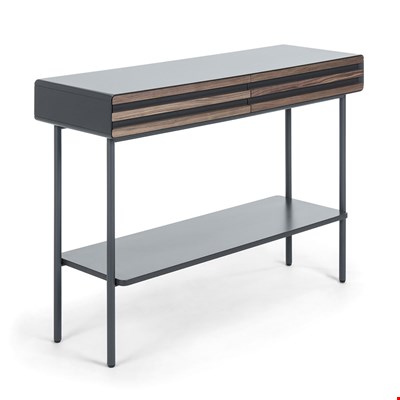 Add some style to your hallway with the Mahon Console Table, the perfect way to create some extra storage space. With two drawers and a shelf beneath it's ideal for holding little knick knacks or could even be the designated man drawer! The MDF body finished with a graphite lacquer combined with the walnut veneer of the drawers gives this table a bold, contemporary look. So whether you use it in the entrance way for somewhere to pop your keys as you walk in the door or in the kitchen to keep your recipe books, it will bring sophistication with it.