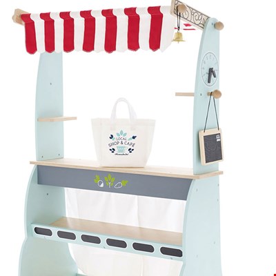 - A two in one reversible wooden Shop and Café stall on wheels with 2 stabilisers