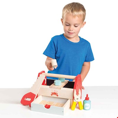 Perfect for any little handy-man or miss; encourage creative and imaginative play with the Le Toy Van Tool Box and Accessories set. Watch as they help around the house, fixing things you didn’t even know were broken! This stunning set includes 11 individual tools all in primary colours, enough to keep any budding builder busy for hours. Quickly set them to work with the screwdriver, pliers, hammer and screws and nuts all tucked away inside the solid rubberwood toolbox with drawer. Featuring a chalkboard on one side, this gorgeous set can be completely personalised with doodles, messages or why not try practising spelling and numeracy together. For other lovely wooden toys, see more from Le Toy Van!