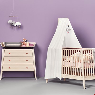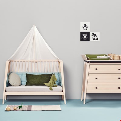 This Linea Baby Cot in Beech by beautiful nursery furniture designer Leander is just one of the fantastic products we are delighted to add to the Cuckooland nest. Designed and made in Denmark, these quality innovative pieces add a touch of class to any child's bedroom. Linea means line; the collection reflects its name with clean sharp lines and an edgy urban feel yet still remaining feminine, sophisticated and soft. The Linea Cot starts life with its base at the highest position making it easy for mama and papa to reach in and lift the little piglet out for a snuggle; as time passes and tiny arms and legs grow longer, the base can be moved into its lower position. As soon as your naughty pickle learns to climb over the rails, one side can be removed to create a toddler bed of sorts (safer for everyone!). Before you know it, that little pixie will be needing a new big girl's or boy's bed! But never fear, at that stage you can transform the cot into a small sofa with a choice of seriously funky coloured cushions which are guaranteed to brighten up what is now a playtime lair! With plenty of scrumptious accessories to choose from, this cot really is a truly versatile piece of baby furniture and one that we think you will absolutely love. Mix and match your colourful accessories to create your own unique version of this fabulous nursery range.