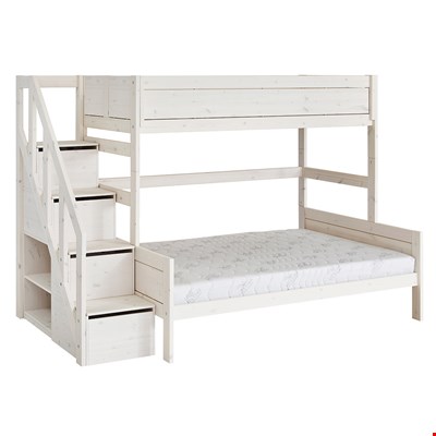 The Family Bunk Bed with Steps from Lifetime is a wonderful piece of furniture that not only looks good but that is functional too! Beautifully manufactured from solid pine and handcrafted in Denmark, it features a stunning whitewash finish plus the front panel can be customised with a range of colours and designs to choose from. With a double mattress bottom bunk and a single mattress top bunk, this bunk bed with steps is ideal for families with a bigger age gap between children. Complete with steps for your youngster to get to the top, not only are they fun but also practical! With storage in each step plus shelving at the side, it's perfect for storing toys and books.