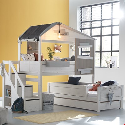 The Hideout Corner Bunk Bed with Steps from Lifetime is sure to stand pride of place in your kiddies room. Just look at it! We can safely say it is the bed of dreams. Your dreams, our dreams, everyone's dreams. Designed to look like a tree house, with different coloured slats used to create a rustic finish, your littleun will have a whale of a time playing make believe. Complete with steps for your youngster to get to the top bunk, not only are they fun but also practical! With storage in each step plus shelving at the side, it's perfect for storing toys and books. Beautifully manufactured from solid pine and handcrafted in Denmark, with a fabric roof including a window they can create their very own den whilst gazing at the stars - sounds perfect to us!