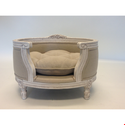 This Classy Louis XVI style dog bed in Linen Ecru, has a striking curved solid oak frame and a matching fitted cushion for regal comfort!