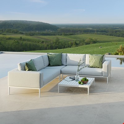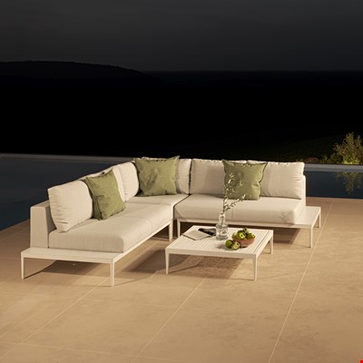 • Set includes: 1x left sofa, 1x right sofa, 1x corner section, 1x aluminium coffee table, 2x removable arms & side table glass