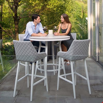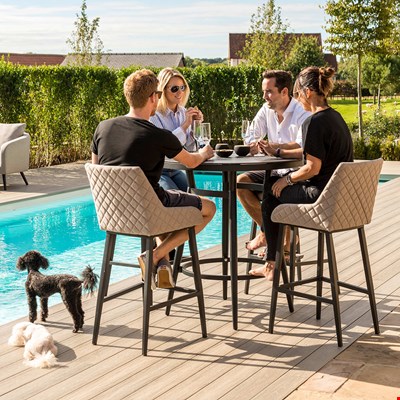 Complete with a stylish round bar table and 4 bar stools, the Maze Rattan Regal 4 Seat Round Bar Set is the ultimate spot for entertaining! The bar stools have been covered and cushioned with weatherproof, UV and stain resistant materials so whatever the weather you can leave your garden furniture outdoors. Featuring an attractive quilted design and spray stone table top, this might just become your new favourite spot! Quick drying, easy on the eye and super comfortable Maze Rattan have thought of everything. Available in a choice of colours, select the set to suit your space! Now grab a few glasses and enjoy your new Maze Rattan garden furniture!