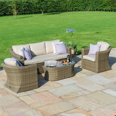 The Maze Rattan Winchester 3 Seat Sofa Set With Fire Pit is going to not only add character and warmth to your garden but will also become such a statement piece. Its showerproof natural coloured cushions and natural weaved frame intertwine together so beautifully making it so adaptable for any area it's placed. Invite your guests over and be sure to stay warm throughout the evening. This set caters to all needs, it's not just a summer essential. Its ability to withstand all weather will come in handy for all 4 seasons, just simply whack the fire on during those colder months and get cosy under the stars or enjoy afternoon tea throughout the height of summer