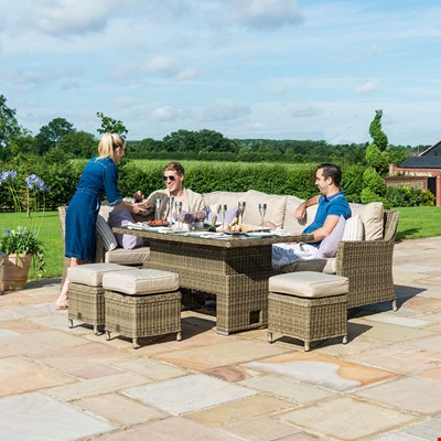 The Maze Rattan Winchester Corner Dining Set with Ice Bucket and Rising Table would be a great addition to your outside space. Perfect for family BBQs or outdoor entertaining, there's plenty of room for everyone to relax on the corner sofa and 3 stools. Sink into the luxurious showerproof cushions and enjoy dining out in the garden. Featuring an integrated ice bucket at the centre, the height adjustable table can easily be converted from a dining table into a coffee table and adapts to suit your needs. Manufactured from the highest quality PU rattan woven onto a powder coated aluminium frame, this garden set would be perfect outside and inside - from the patio to the conservatory! Finished in natural and beige tones and part of the Winchester collection, when your outdoor furniture looks this good you'll want to spend every waking moment sat down!
