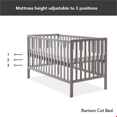 Convertible and with a 3 position base height, the Obaby Bantam Cot Bed offers great features at an incredible price! Start with the mattress in the top position and save your back when comforting your baby. And when they start to gain confidence with sitting and standing, simply take the mattress down another level ensuring they're safe at every stage of their development. Complete with teething rails, their little pearly whites will be protected too! Available in a choice of colours, the wooden bed frame can be converted into a toddler bed once your baby is big enough to get in and out unaided! Suitable until they're approximately four years of age, this modern cot bed is the perfect choice for the nursery!