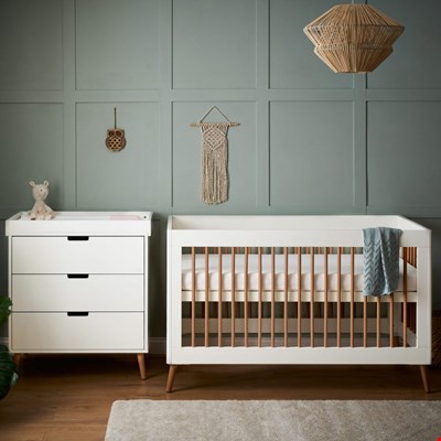 Looking for something a bit different for the nursery? Inspired by Scandi styles, the Obaby Maya Cot Bed 2 Piece Nursery Furniture Set would be the perfect choice! The full-size cot bed has lots of features, including a height adjustable base and a convertible frame. Save your back and start with the mattress in the top position and simply lower the height as your baby gains confidence. Designed to adapt to their needs, when your tot has outgrown their baby bed, easily remove the side and replace with the safety rails. It can even transform into a toddler bed and later to a day bed. Including a matching dresser; the removable changing top, recessed handles and 34L drawers make it just as practical! Perfect for those night-time changes, have easy access to essentials and when they've outgrown the changing table, the chest of drawers can still be used for years to come! Why not add the matching shelf with clothes rail and utilise your wall space!