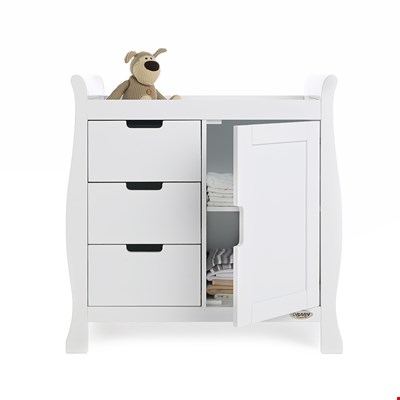 - Changing unit has 3 generous storage drawers and one full length cupboard with an adjustable shelf