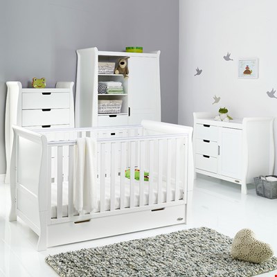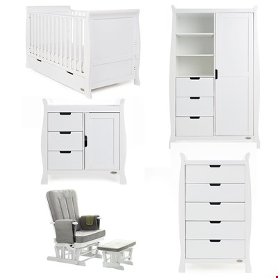 Suitable from birth to 4 years, the stylish Obaby Stamford Sleigh Cot Bed 5 Piece Nursery Furniture Set can be adjusted to suit the needs of your little one as they continue to grow! The sleigh cot bed features 3 height settings, so when your baby starts sitting and standing independently, the mattress base can be lowered, ensuring they are safe and secure at all times. When they've outgrown their baby bed, remove the sides and convert the frame from a cot to a junior bed and continue using this gorgeous design for years to come! Boasting a spacious under-bed drawer, bedding and toys can be kept neat and tidy. Including a deluxe reclining nursing chair and footstool, the gentle rocking motion soothes baby and helps you relax. Including thick cushions with handy storage compartments, whether it's feeding time or story time, both you and baby will love this glider chair! Suited to storing clothing, nappies and nursery essentials; the matching tall dresser includes 5 deep drawers while the changing unit provides three extra drawers and a full length cupboard with an adjustable shelf and an elegant top to hold changing mats in place. Including a stunning double wardrobe with additional storage drawers and adjustable shelves, store baby clothes in the full length cupboard with two hanging rails. All drawers open and close smoothly and the recessed handles prevent trapped fingers! Perfect for little hands! With more than enough storage, the nursery will be stress and clutter-free! With other colours to choose from, you are sure to find the ideal set for you and your little bundle!