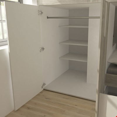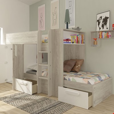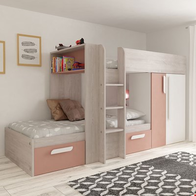Storage, storage and more storage; the Trasman Barca Bunk Bed with Wardrobe is one amazing bed! The reversible design means it will work in almost all bedrooms! Helping save on floor space, the double wardrobe opens out to reveal shelving and a clothes rail. The storage shelf is perfect for displaying books and trinkets. And with 2 pull-out storage drawers there's plenty of space for extra clothing and bedding. Designed to create 2 separate cosy sleeping spaces, there is plenty of privacy for each child making sharing a little easier. There's even space for a lamp on the bottom bunk - perfect for night time reading. Available in a choice of colours, all with a wood effect finish, this scandi-style bunk bed would be perfect for growing kiddies. With other configurations available in the Trasman collection, select the bed to suit your needs!