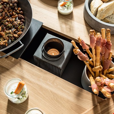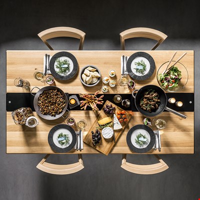 • Hot pans can be placed on the metal in the centre to keep from damaging the table