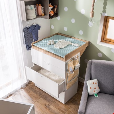 With its contemporary design and simple styling, 4 You 3 in 1 Baby & Toddler Cot Bed 2 Piece Nursery Set in White & Oak from Vox is the ideal choice for any nursery! Not only does the 3 in 1 Baby and Toddler Cot Bed  transform from a cot to a junior bed, oh no...the frame of the cot can be flipped upside down to create a stunning, sturdy desk. A wonderful bed for your little one to grow up with! The cot base can be adjusted to different heights allowing you to adapt it to your little one's needs and as your toddler begins to gain confidence and wants to explore, the three removable bars are perfect for some independence! The chest of Drawers have two small drawers at the top, perfect for those little booties and bibs whilst the two larger drawers at the bottom will have no issue housing all your babies other bits and bobs! The optional changing table top would also make the ultimate baby changing station with all those essentials close by and with the large gap behind it would be great for storing all those nappies that babies inevitably go through! What's better, when no longer needed the changing table can be easily removed leaving you with a lovely chest of drawers
