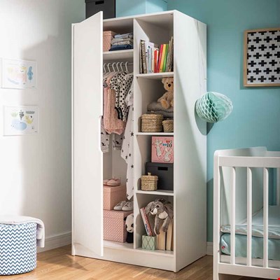 • Wardrobe has a large door that opens to reveal a hanging rail with 4 separate storage shelves on the left side