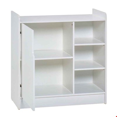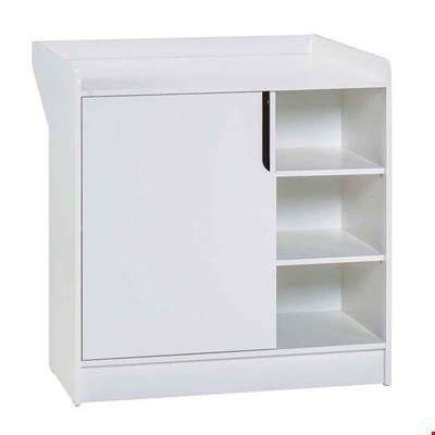 • Changing table can be used as a changing table or as storage, featuring 5 compartments - 2 large shelves contained behind a single door and 3 open shelves