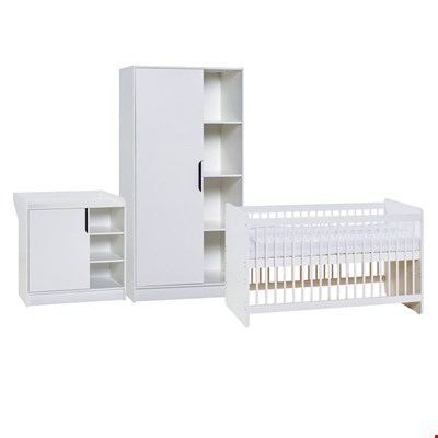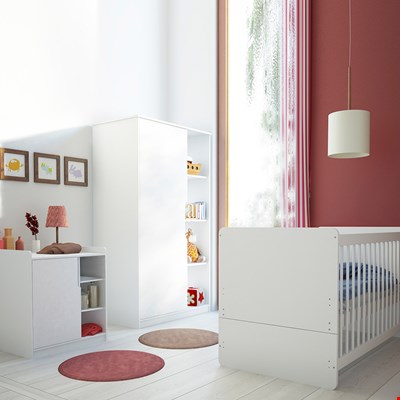 From birth and beyond, the Vox Maxim Nursery Set will adapt to suit your little one's needs! The contemporary styled set comes complete with a height adjustable cot bed, featuring 3 removable bars to help encourage independence as they grow. And when they're not so mini anymore, simply convert into a comfortable junior bed and continue using the gorgeous frame. The wardrobe offers plenty of space to hang their adorable outfits and with individual compartments, toys, books and nappies can be neatly organised and kept out of the way. And if you're still in need of storage, the Changing unit can house all of their other nursery room essentials. Including a removable changing table, when it is no longer needed you are left with a lovely chest of drawers for your youngster to grow up with. Styled in white, whether you're having a little man or miss, finding matching decor, accessories and bedding will be a breeze! Stylish and practical, with the Maxim set, you'll be ready when your little bundle finally arrives!