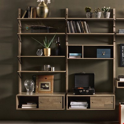 The Gyan Bespoke Wall Storage Unit is a truly wonderful and unique piece of furniture from Woood! Made from FSC® fumed Oak, this shelving unit can be assembled in any way you choose! Two different cabinets, a shelf and a desk make up the elements of the Gyan Wall Unit; put these all together and you've got yourself a handy piece of storage! Display your family photos, keep your knick-knacks tidy, even do a bit of work at the desk, the Gyan modular shelving unit has all you need! Either choose from the four pre-configured layouts - please refer to the images and the features and benefits and see what's included - or you can pick any of the elements individually to create a wall unit completely unique to you!